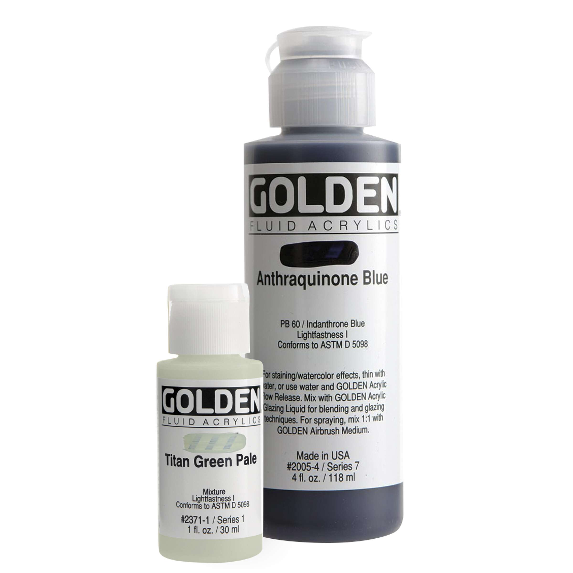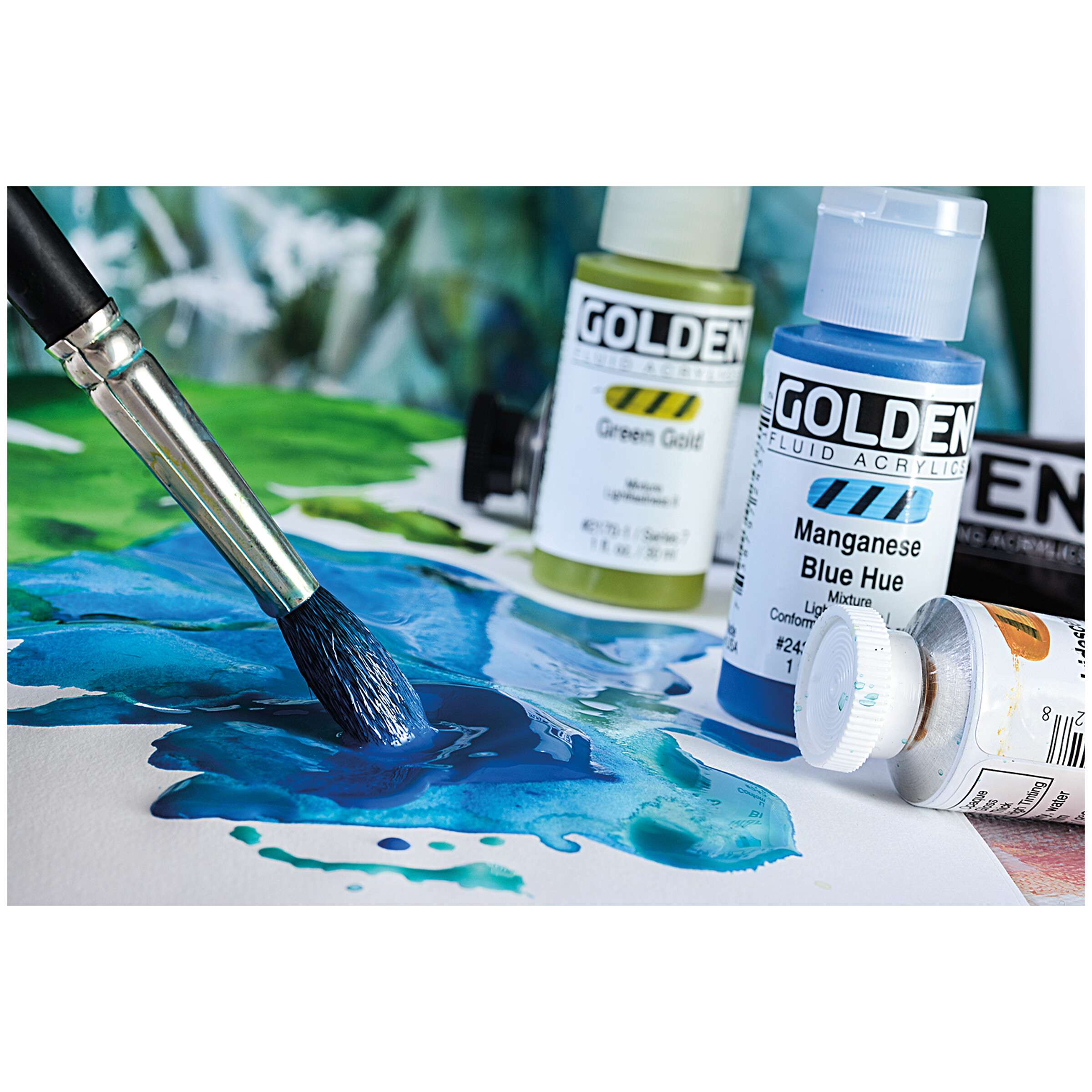 Golden Fluid Acrylics har en cremet konsistens. De højpigmenterede farver indeholder ingen tilsætningsstoffer som eksempelvis matteringsmiddel eller fyldstoffer, hvilket resulterer i en høj brillans. Fluid Acrylics er lysægte, ældningsbestandige og fleksible. Farverne har en jævnt flydende viskositet og er meget velegnede til detaljearbejder, tørpenselteknikker og lasurer. De kan påføres med pensel, hældes eller sprayes på. Ved tilførsel af vand bibeholdes farvens kvalitet.