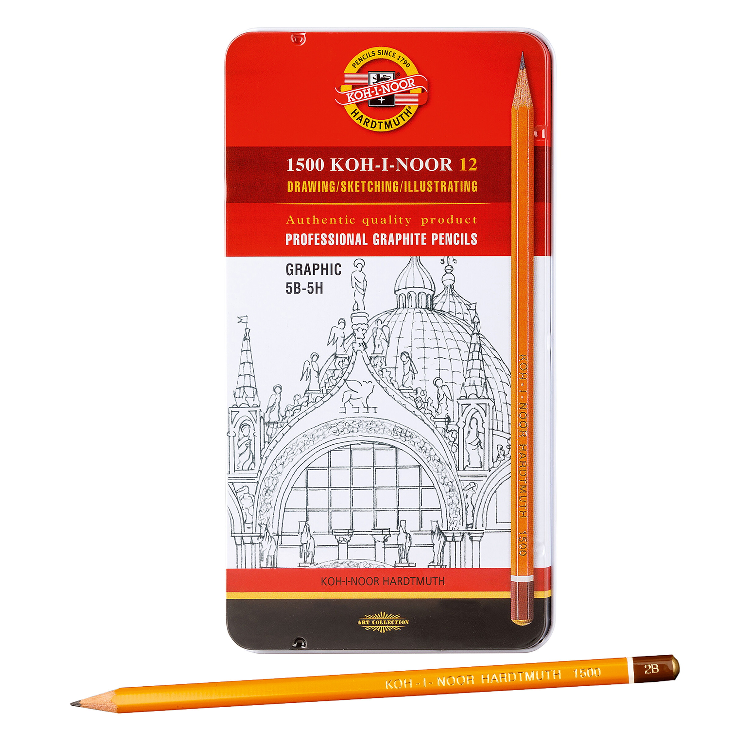 Sættet i den stabile metalkasse indeholder 12 blyanter i følgende hårdhedsgrader: 5B, 4B, 3B, 2B, B, HB, F, H, 2H, 3H, 4H, 5H.