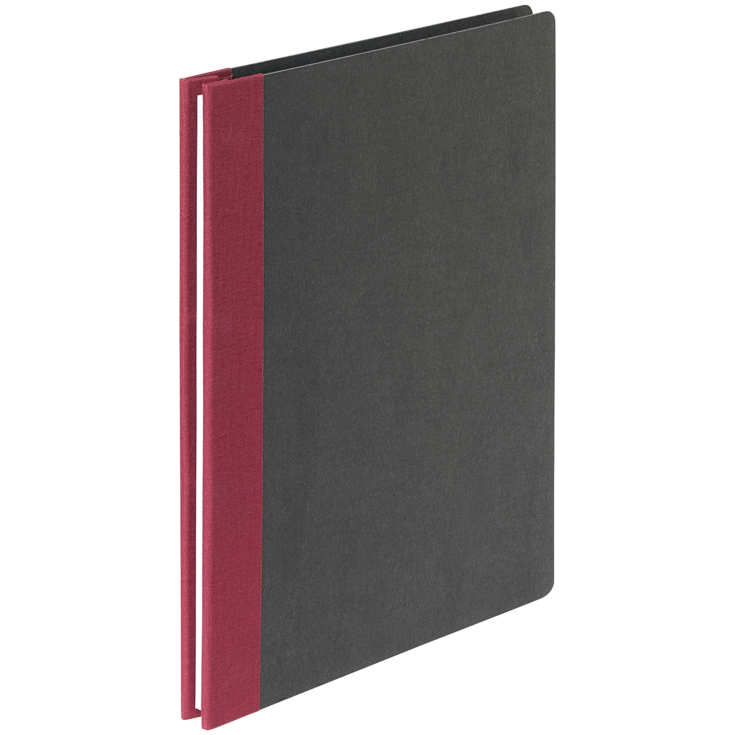 Bogbinderkvalitet. Lågene består af antracitfarvet, 2 mm tyk hård pap. Mappen har afrundede hjørner, ryggen er betrukket med mat lærred. Indbindingen består af to forniklede bogbinderskruer, de hæftede sider er derfor nemme at skifte ud. Mappens fyldhøjde kan indstilles alt efter skruernes drejning. Mappen er enkel i sit udseende, men er alligevel fremstillet i krævende håndarbejde og imponerer med sin høje funktionalitet. Henvisning: Hvis du vil ændre mappens fyldhøjde, kan bogbinderskruerne skiftes ud, se afsnittet Bogbinding. Uden indhold. Fremstillet i Tyskland.