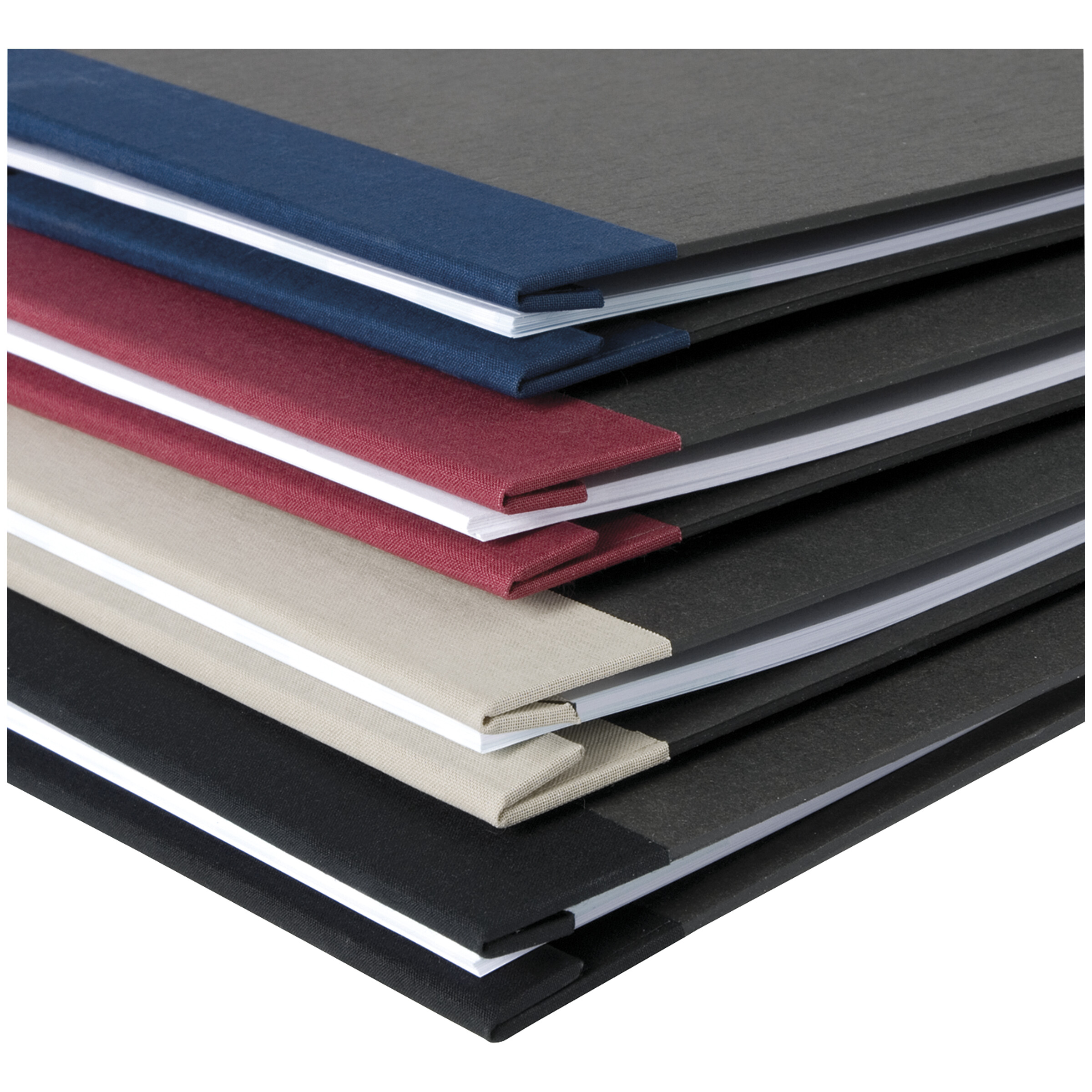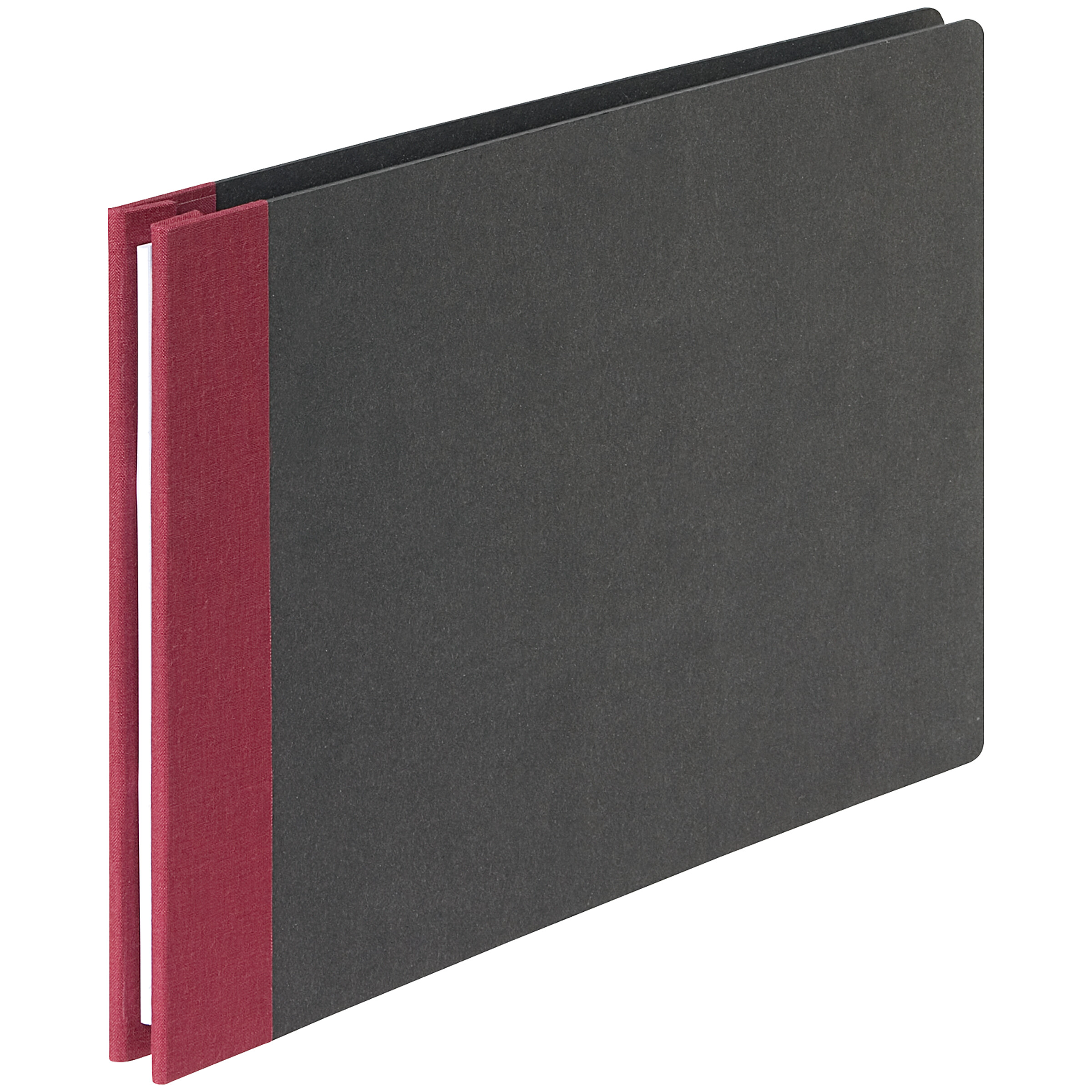 Bogbinderkvalitet. Lågene består af antracitfarvet, 2 mm tyk hård pap. Mappen har afrundede hjørner, ryggen er betrukket med mat lærred. Indbindingen består af to forniklede bogbinderskruer, de hæftede sider er derfor nemme at skifte ud....