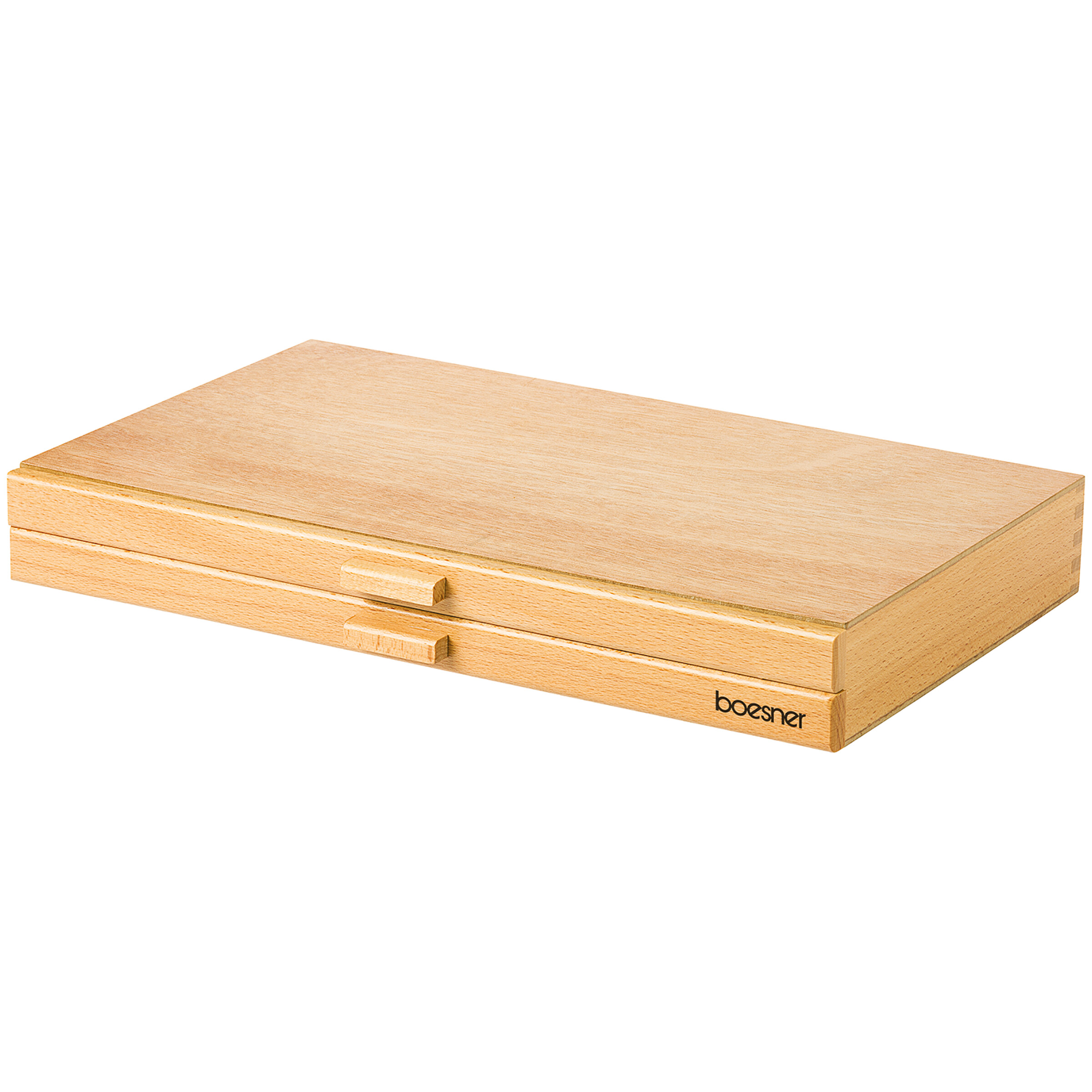 Mere overskueligt og pladsbesparende kan tegnetilbehør og maleudstyr ikke opbevares: Skuffekassen af massiv bøg giver rigeligt plads til pasteller, blyanter, kridt og meget mere. Den fås valgfrit med to skuffer (ydermål: 40 x 24 x 6 cm) eller tre skuffer (ydermål: 40 x 24 x 8 cm), som hver især er opdelt i praktiske rum. Ved behov kan flere kasser også stables ovenpå hinanden.